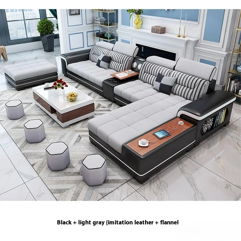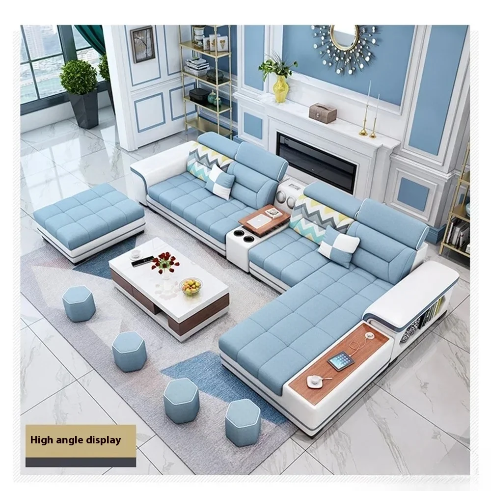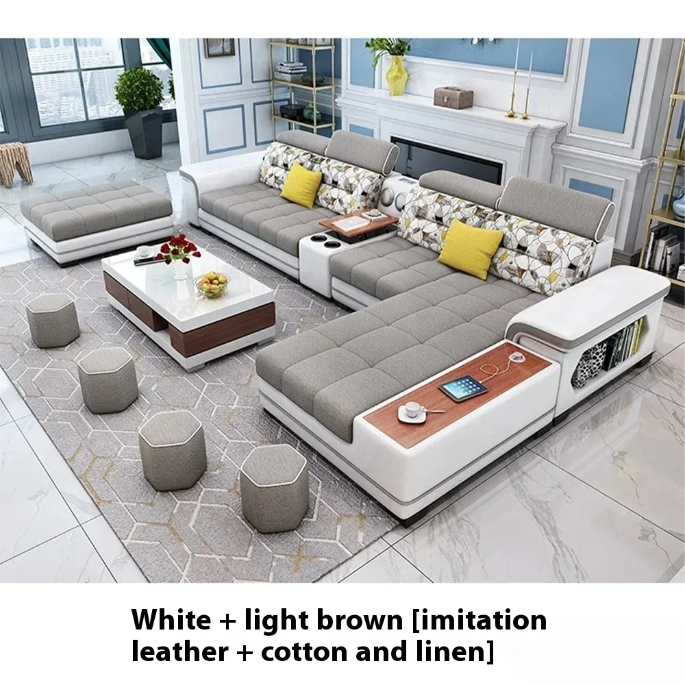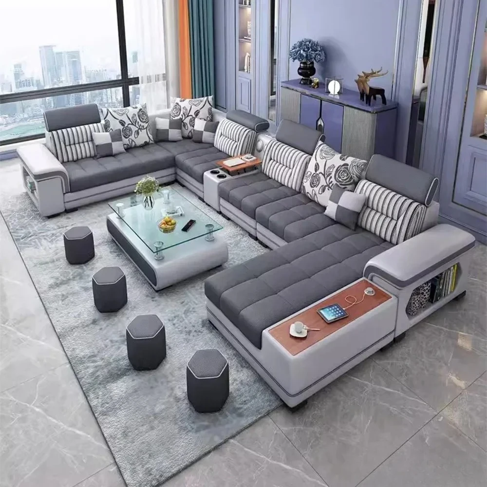 Fabric Sofa Set Furniture Living Room Sofa Set with USB and Stools / Big U Shape Cloth Couch Sofas for Home Furniture