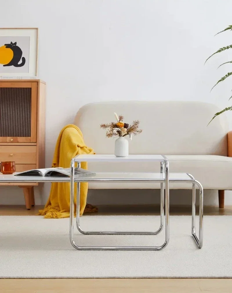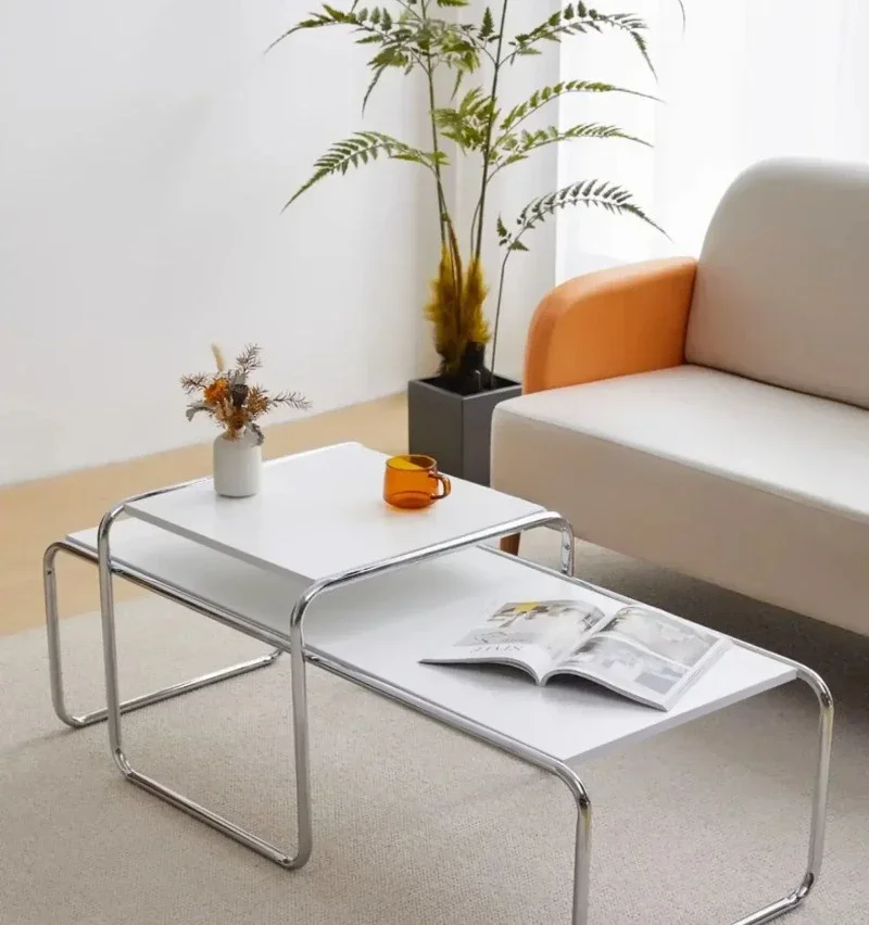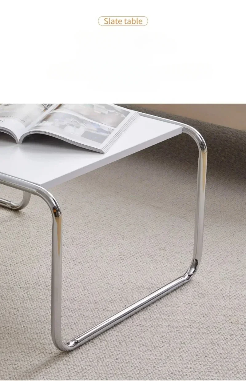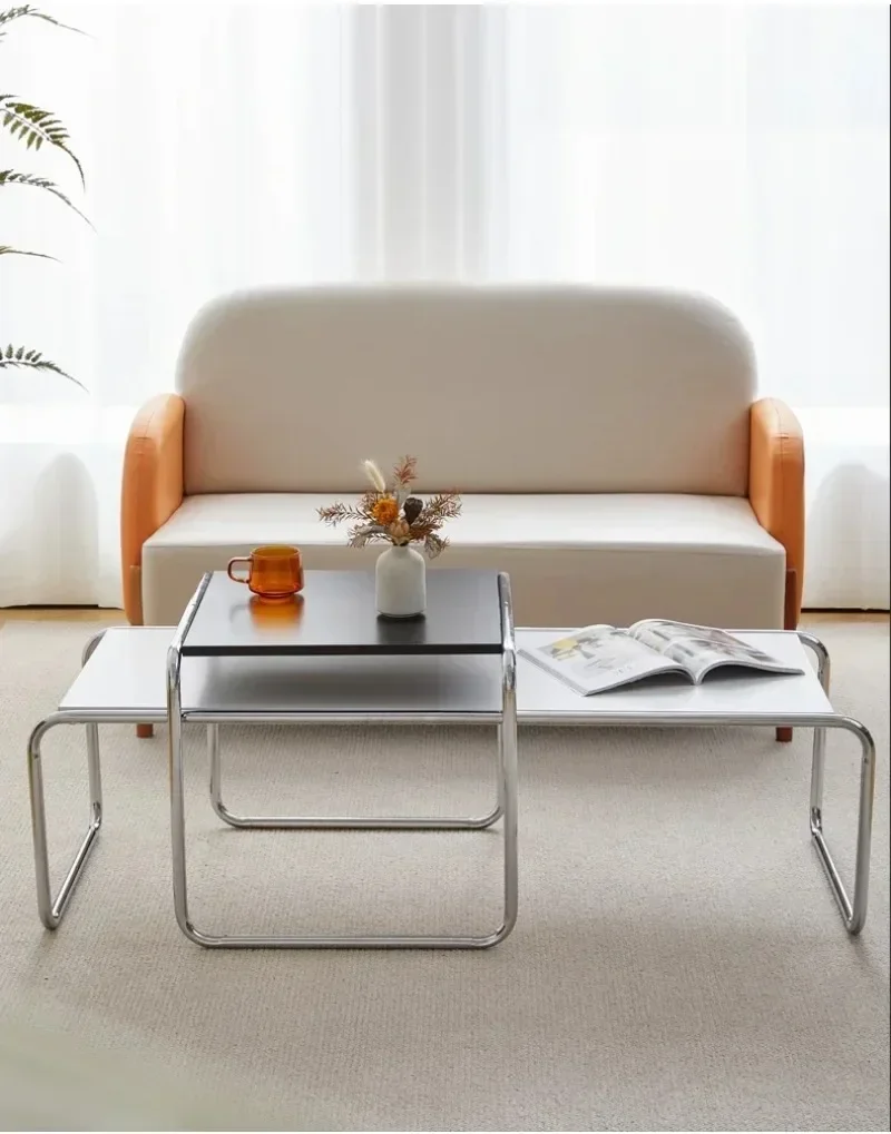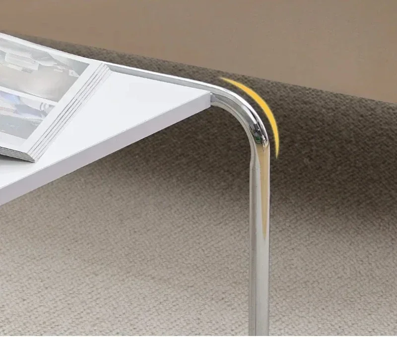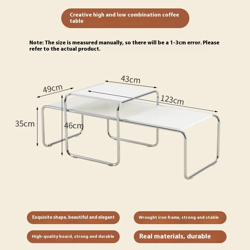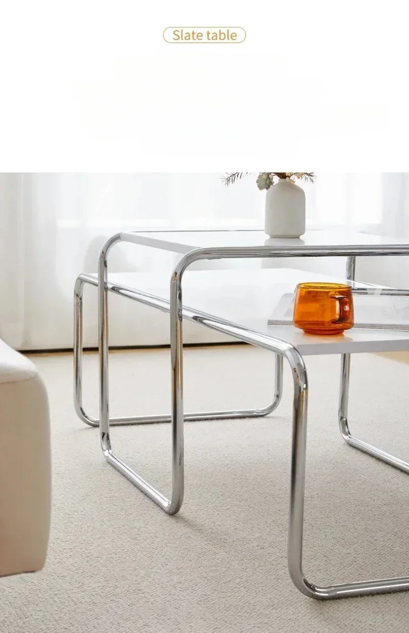 Function: This Nordic minimalist designer medieval coffee table, with its unique modern design style, adds a touch of simplicity and style to the living room. As one of the core furniture in the living room, it not only carries the basic functions of placing items, such as magazines, small cups and other daily necessities, but also becomes the visual focus of the whole space with its elegant rectangular appearance and white tone. The metal frame design under the coffee table not only enhances its structural stability, but also subtly contrasts with the white panel above, showing a low-key and exquisite aesthetic feeling.